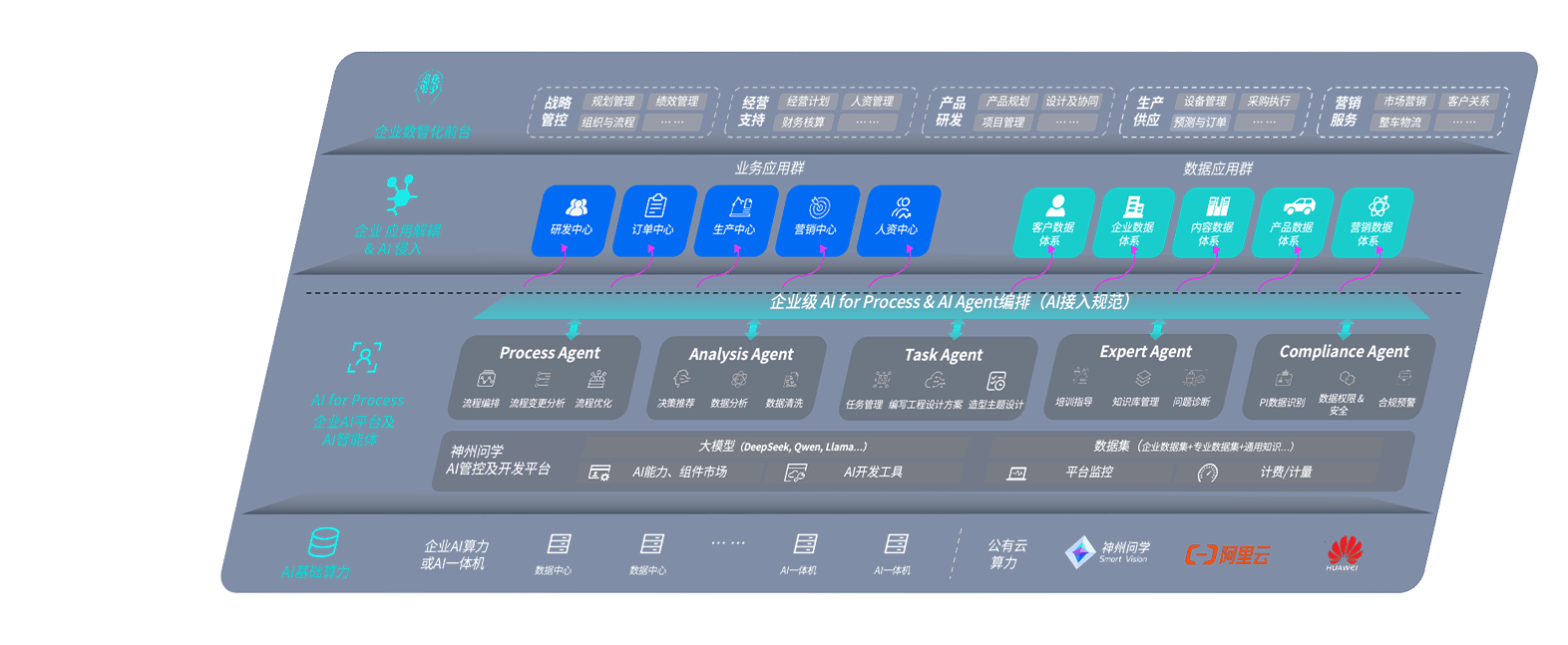 端到端的一站式AI工作空间深度融合了从企业战略规划到日常经营的全流程业务板块,,,,定向解决车企内部领域多、、、部门多、、、链条长、、、场景碎片化等难题,,,,支持车企快速构建以AI为核心的生产力写作体系,,实现任务执行与AI能力的无缝集成与交互
